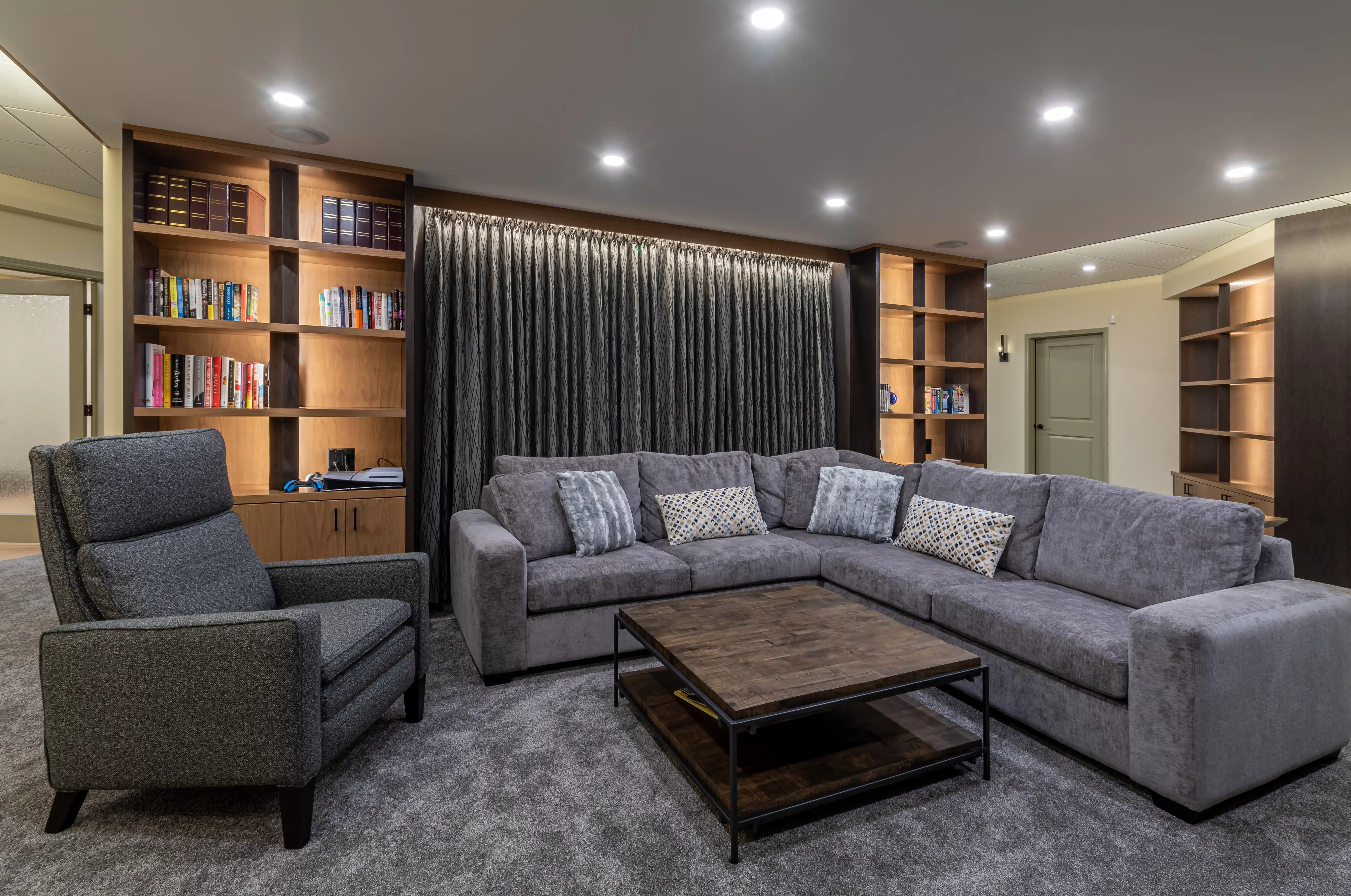 The Gallant Residence by Netley Millwork highlights a warm, contemporary approach to custom millwork, blending rich textures with functional elegance. The family room showcases floor-to-ceiling built-ins with warm wood tones, open shelving, and integrated storage that frame the cozy seating area, creating both a practical and inviting retreat. A custom wet bar adds refinement with its mix of dark upper cabinetry, textured glass inserts, wine storage, and light wood base cabinets, complemented by a sleek gray countertop and modern black fixtures set against a subtle tiled backsplash. Throughout the residence, thoughtful details—like recessed lighting, tailored shelving, and durable cabinetry—bring cohesion to the space while emphasizing comfort and style. From the entertainment-ready living area to the smartly designed bar and storage solutions, the Gallant Residence reflects Netley’s commitment to blending craftsmanship with modern family living.